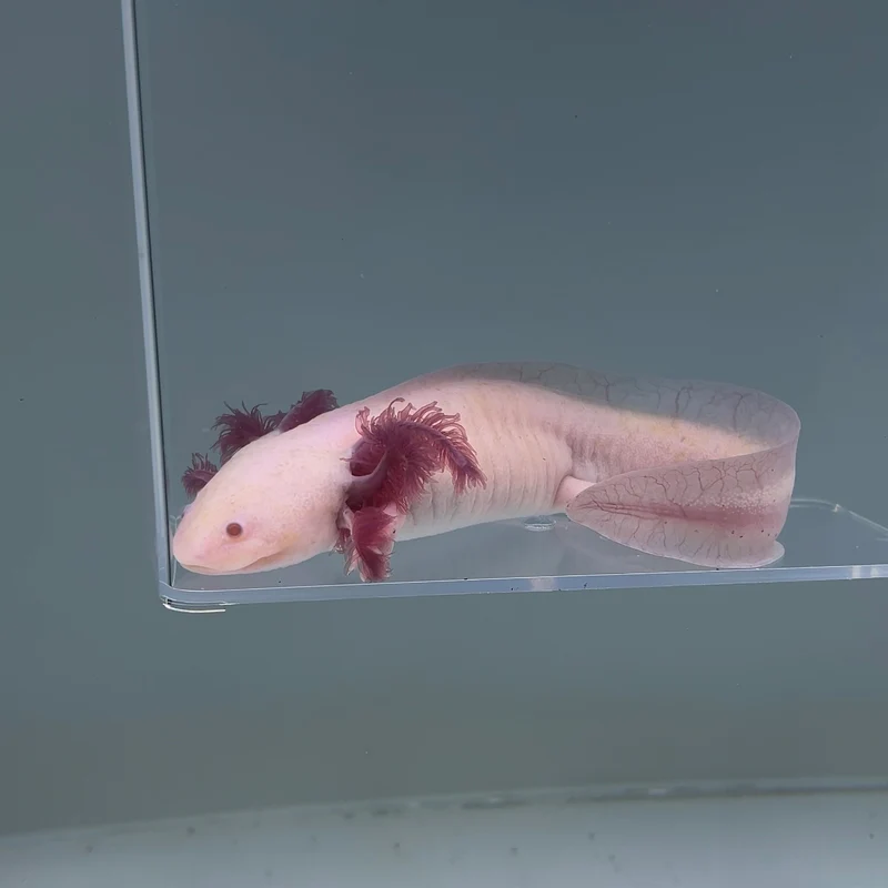 Ember is a Hypomelanistic Melanoid Axolotl! Her lavendar-colored gills provide a striking contrast between the pink-beige color of her body. If you look closely, you can even see the light-yellow pigments that can only be seen due to her lack of dark pigmentation from the hypomelanistic gene.